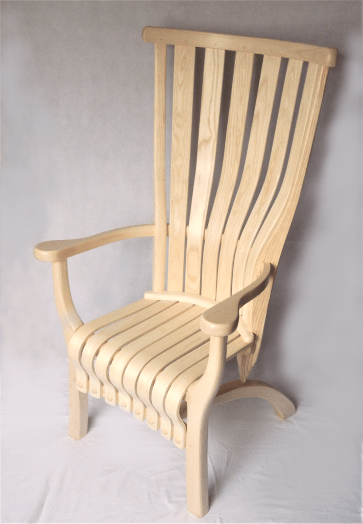 The shape of the front leg follows the grain in the Ash tree. When the leading shoot of the young tree is eaten by a deer a side shoot takes over and creates this pattern. If you split the tree in half 25 years later and season it for a year you get a right leg and a left leg. There are 9 grown bends in this design, and 25 steam bent parts.