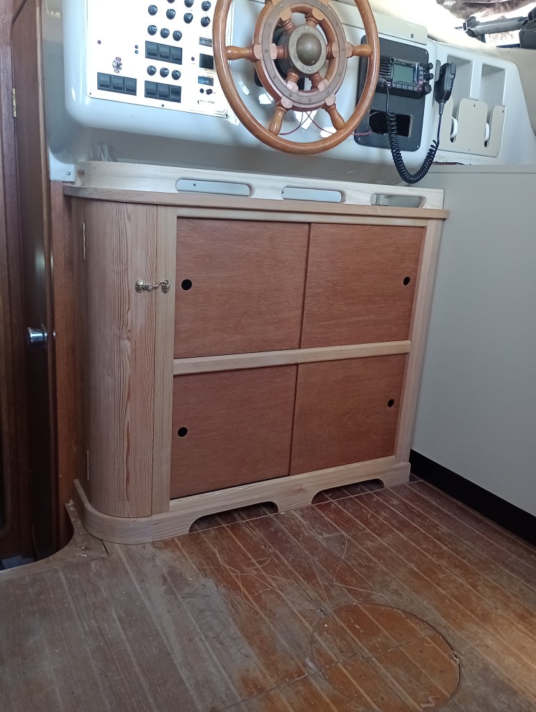 Plate Locker Uncategorized I was commissioned to design and make a cupboard for storing plates on a boat. This is made from reclaimed Pine and Marine ply with an Ash hand rail. It has sliding doors which can be locked in place when the boat is rolling. Share this: Click to share on X (Opens in new window) X Click to share on Facebook (Opens in new window) Facebook Like Loading... Related